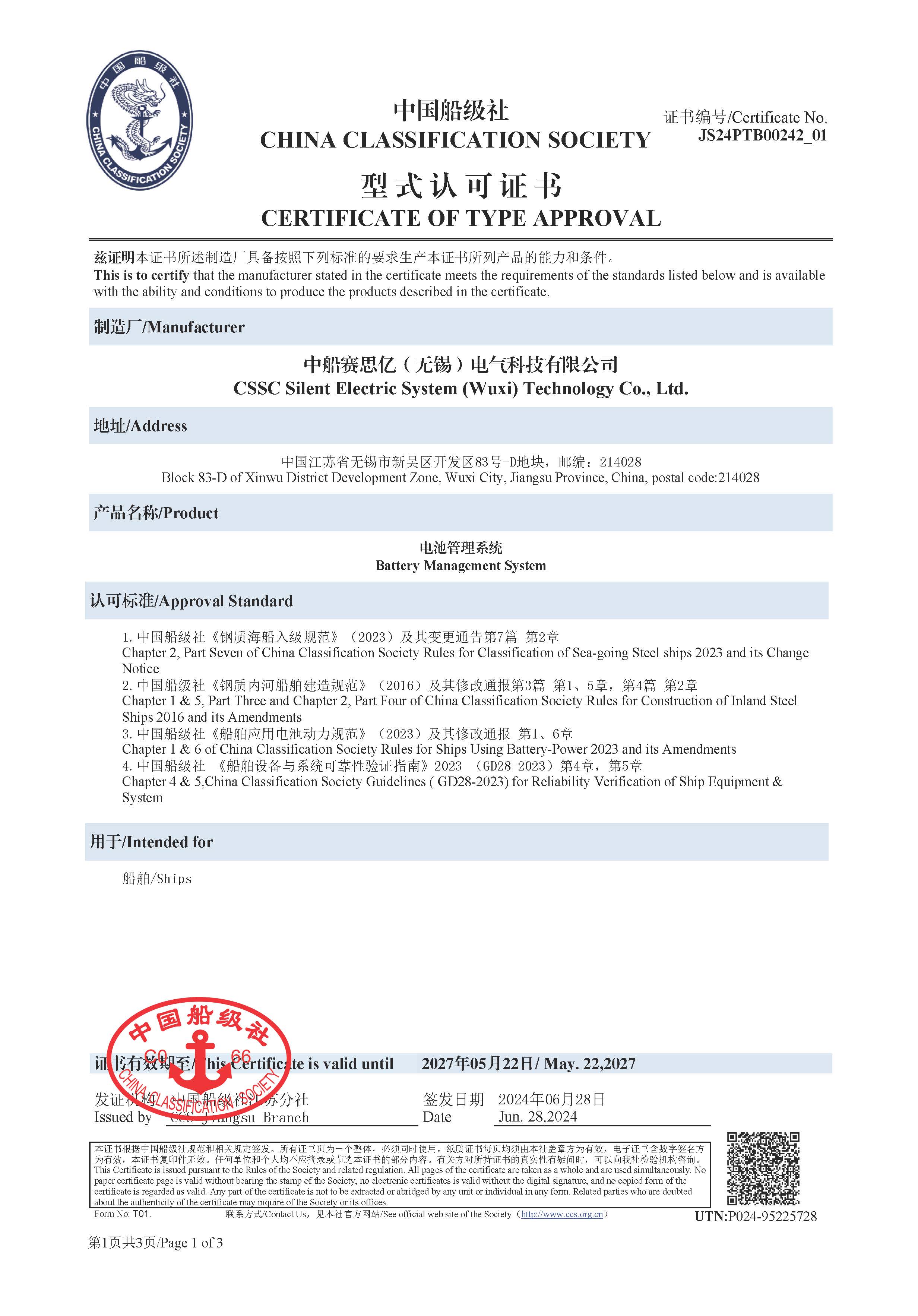 電池管理系統(tǒng)(BMS)型式認(rèn)可證書(CCS)