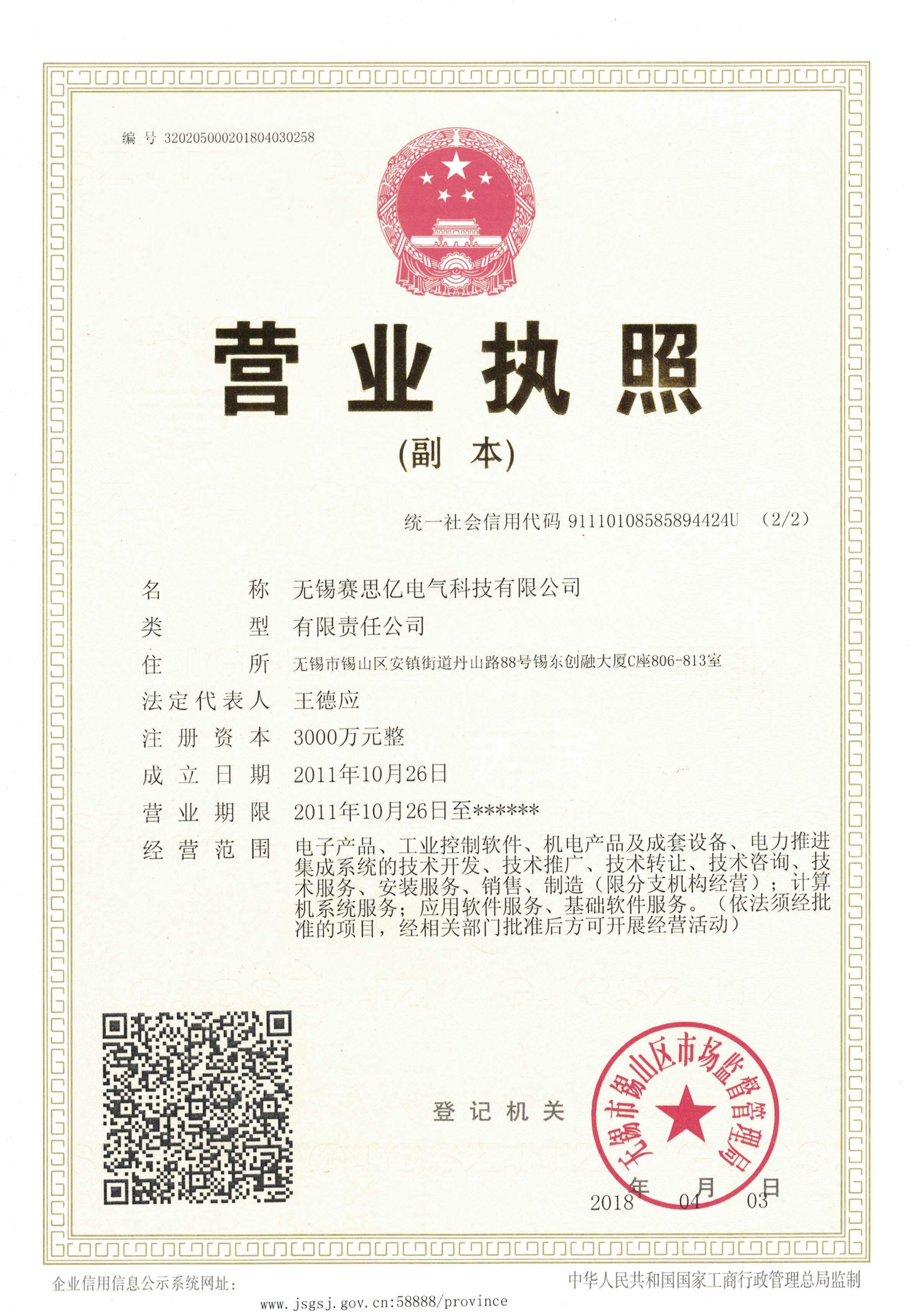 為了適應公司未來經(jīng)營戰(zhàn)略及發(fā)展方向,北京賽思億電氣科技公司自2016年起逐步將生產(chǎn)基地與研發(fā)中心遷移至無錫,以無錫為中心輻射全國,并于近日取得了無錫市錫山區(qū)市場和質量監(jiān)督管理局換發(fā)的《營業(yè)執(zhí)照》,完成了工商變更登記手續(xù),正式更名為“無錫賽思億電氣科技有限公司”。更名后,賽思億的相關股權、人員組成、內部架構和各類合同、合作協(xié)議均保持不變。