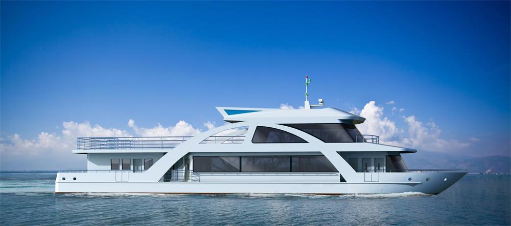 該新能源游船總長34.9m,型寬7m,設(shè)計(jì)吃水0.8m,推進(jìn)功率2*200kW,設(shè)計(jì)航速19 km/h。采用賽思自主知識產(chǎn)權(quán)的直流組網(wǎng)電力推進(jìn)系統(tǒng)(S-Hybrid-R柴電+新能源混合系統(tǒng)),其核心直流組網(wǎng)變頻配電系統(tǒng)采用公司自主知識產(chǎn)權(quán)產(chǎn)品。