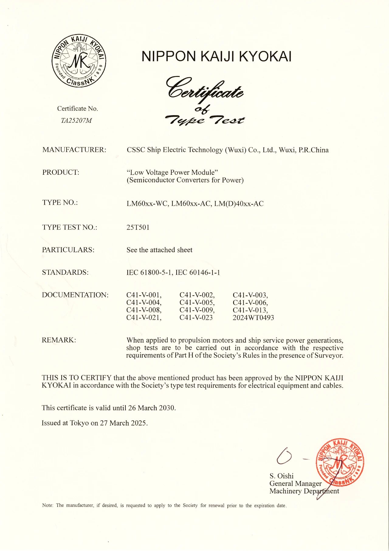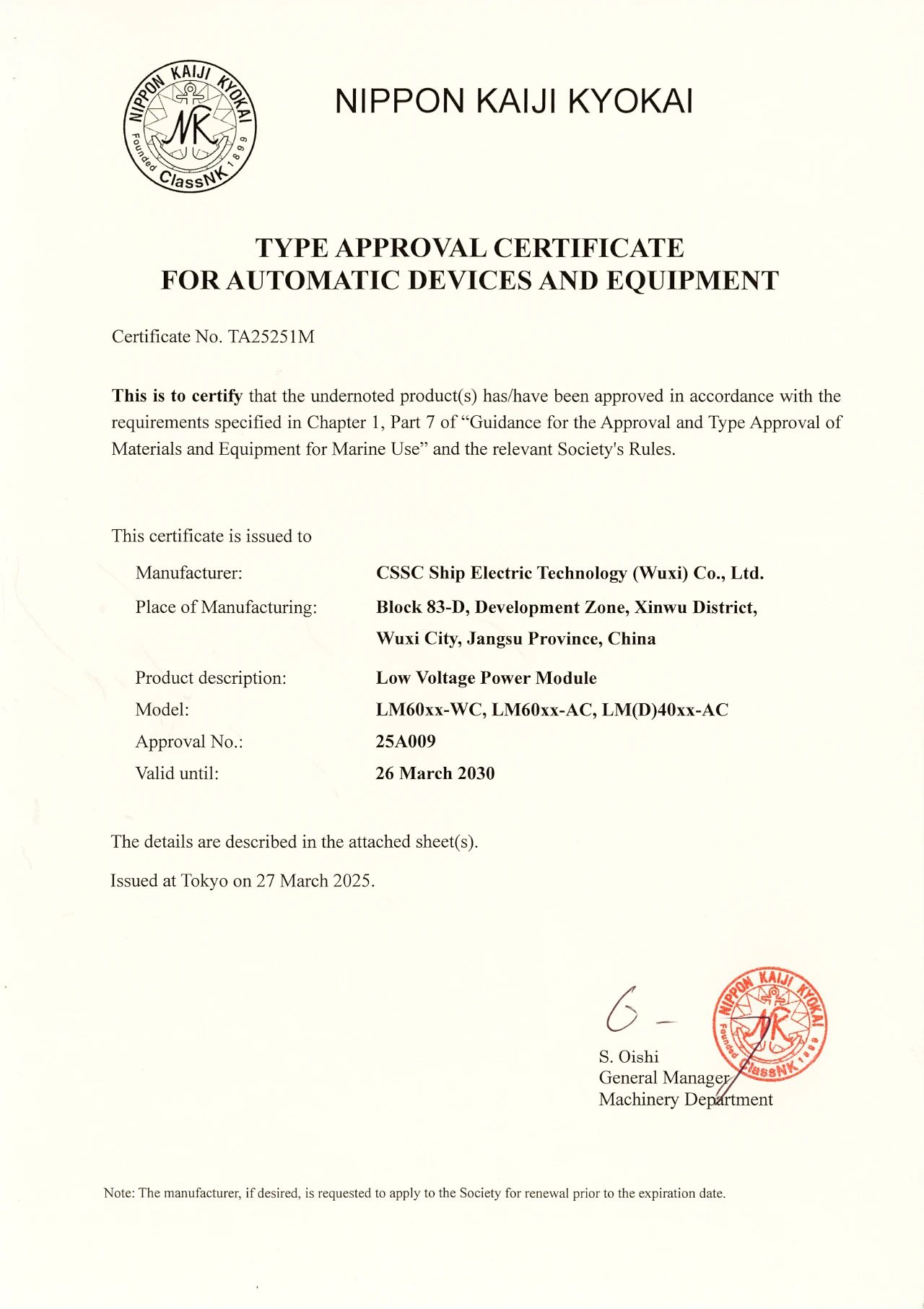 2025年3月27日,中船賽思億(無錫)電氣科技有限公司(CSSC Ship Electric Technology ( Wuxi) Co.,Ltd.)核心變頻電控設(shè)備順利取得日本船級(jí)社(NK)型式認(rèn)可證書,成為國(guó)內(nèi)為數(shù)不多的取得日本船級(jí)社(NK)型式認(rèn)可證書的船舶電力推進(jìn)企業(yè)。目前中船賽思億已取得CCS、BV、RINA、DNV、LR、ABS、NK等七大國(guó)際主流船級(jí)社型式認(rèn)可證書,是目前國(guó)內(nèi)唯一一家擁有七大船級(jí)社型式認(rèn)可證書的國(guó)產(chǎn)船舶電力推進(jìn)企業(yè),對(duì)中船賽思億的海內(nèi)外市場(chǎng)開拓和國(guó)際化發(fā)展進(jìn)程,具有重要意義。