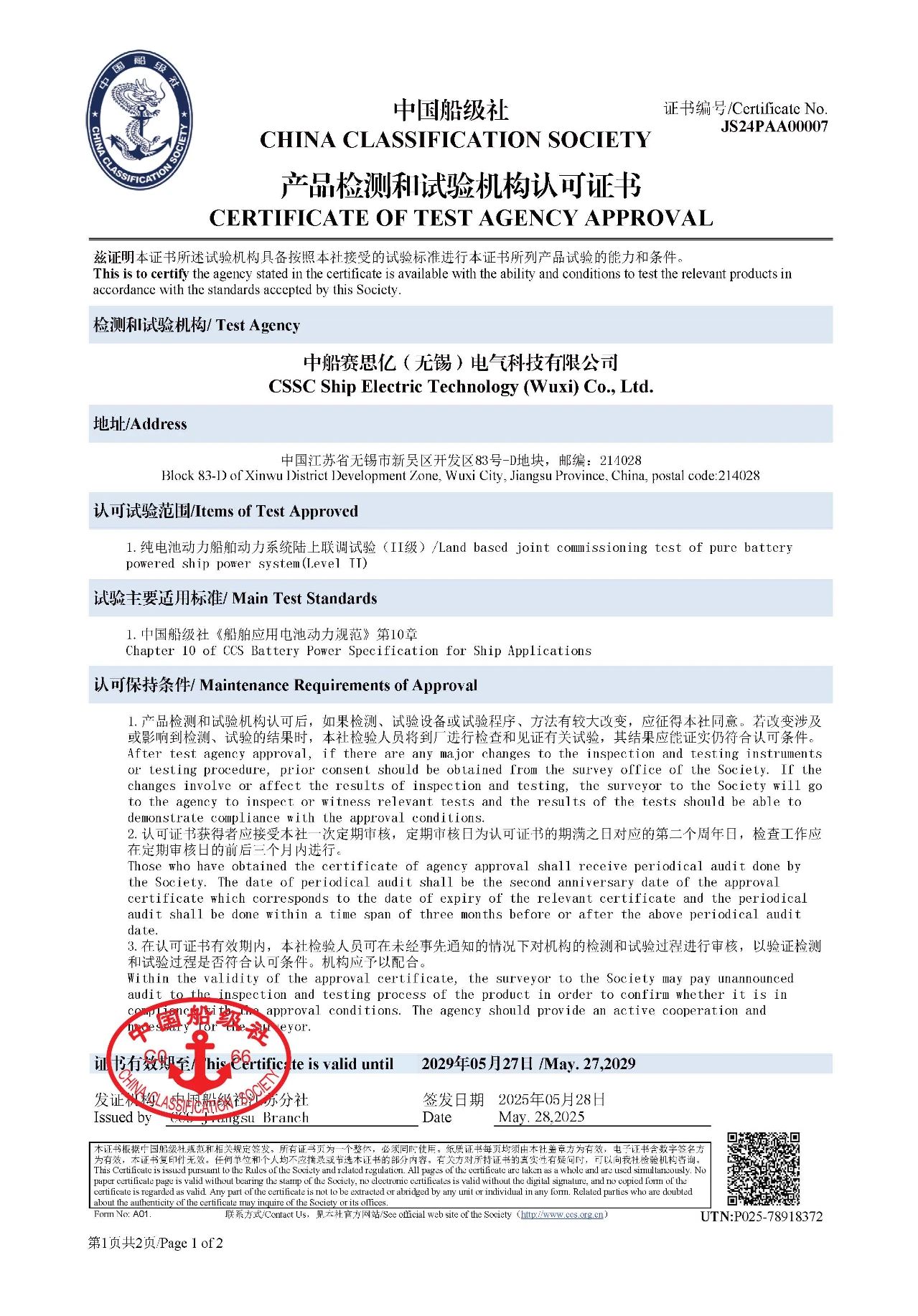 近日,中船賽思億(無(wú)錫)電氣科技有限公司(CSSC Ship Electric Technology ( Wuxi) Co.,Ltd.)順利取得中國(guó)船級(jí)社 (CCS) 產(chǎn)品檢測(cè)和試驗(yàn)機(jī)構(gòu)認(rèn)可證書(shū),中船賽思億自主檢測(cè)和試驗(yàn)?zāi)芰Λ@專(zhuān)業(yè)機(jī)構(gòu)官方認(rèn)證。作為三電系統(tǒng)配套企業(yè),中船賽思億獲此資質(zhì)填補(bǔ)了船舶三電系統(tǒng)技術(shù)驗(yàn)證的 “關(guān)鍵缺口”,后續(xù)可為客戶(hù)提供一套“提前校驗(yàn)完畢”的三電系統(tǒng)。