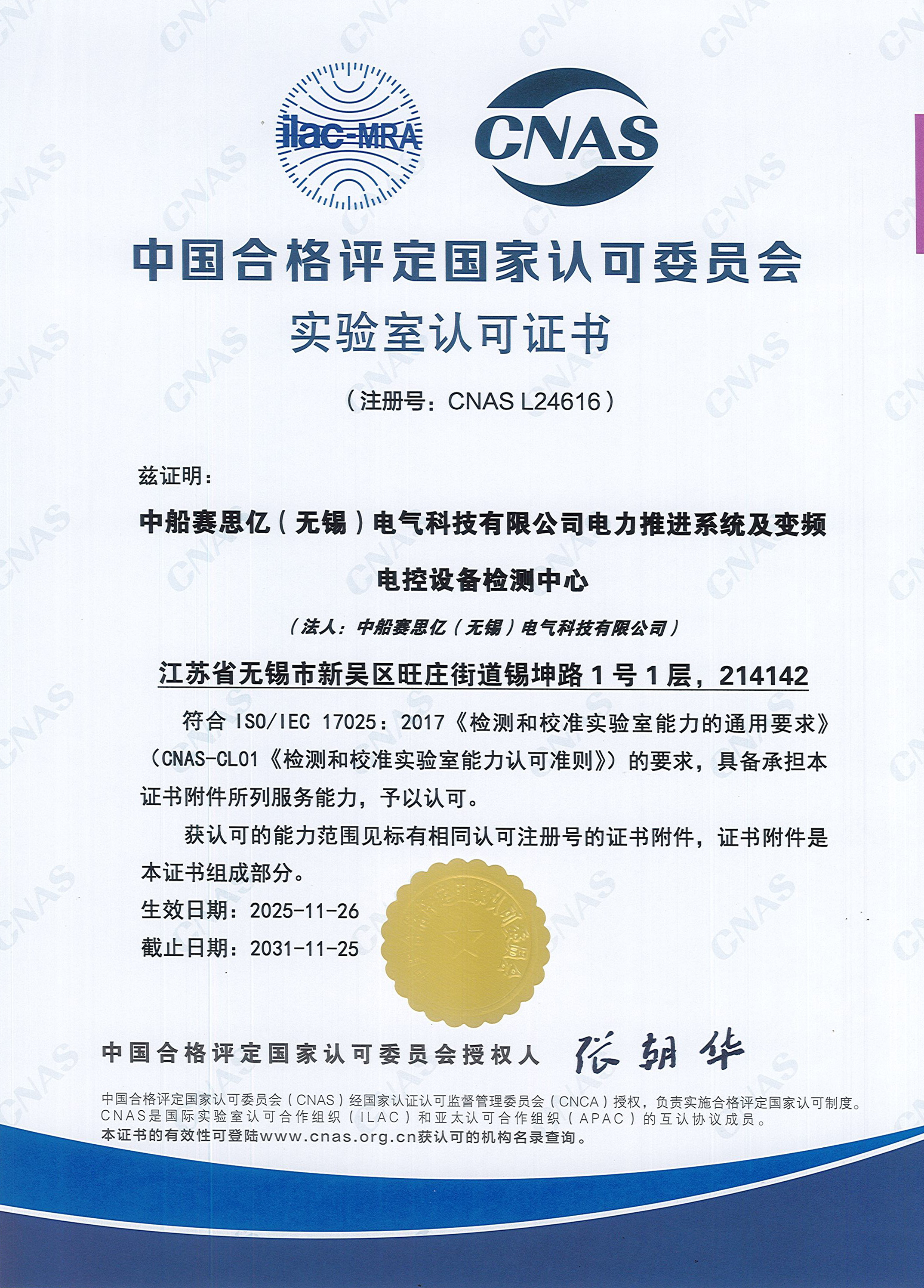 2025年11月26日,中船賽思億(無(wú)錫)電氣科技有限公司(CSSC Ship Electric Technology ( Wuxi) Co.,Ltd.)電力推進(jìn)系統(tǒng)及變頻電控設(shè)備檢測(cè)中心順利取得中國(guó)合格評(píng)定國(guó)家認(rèn)可委員會(huì)(CNAS)實(shí)驗(yàn)室認(rèn)可證書(注冊(cè)號(hào):CNAS L24616),此舉標(biāo)志著中船賽思億在電力推進(jìn)系統(tǒng)性能驗(yàn)證、變頻電控設(shè)備可靠性測(cè)試等核心環(huán)節(jié)的檢測(cè)能力,以及全流程質(zhì)量管理體系已達(dá)到了國(guó)家 / 國(guó)際認(rèn)可的水平,該檢測(cè)中心出具的檢測(cè)數(shù)據(jù)、報(bào)告在國(guó)內(nèi)及互認(rèn)的國(guó)際范圍內(nèi)具備高權(quán)威性和公信力。
