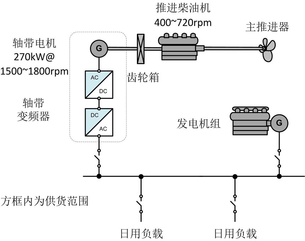 6000DWT瀝青船,采用賽思億S-Hybrid混合動力系統(tǒng),具有穩(wěn)定可靠、電源品質(zhì)高、性價比高等優(yōu)勢,相比于全電力推進系統(tǒng),初始投資小,在不改變船舶原有主機動力形式的前提下,充分利用船舶在遠洋航線的經(jīng)濟航速工況,系統(tǒng)通過主機冗余功率帶動異步電機發(fā)電運行,在提高主機負荷率改善其油耗的同時,可以關(guān)停船舶輔機,節(jié)省了船舶的運營油耗。