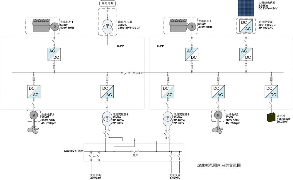 批量四海風行豪華游艇,整個動力系統(tǒng)配置2臺60kW的柴油機組、一套4.6kW的太陽能光伏板、一組105.6kWh的蓄電池組和2臺37kW的主推進電機。在觀光工況下,發(fā)電機組停止工作,使用蓄電池和太陽能為全船供電,可使用蓄電池組連續(xù)推進5小時左右,零排放、振動噪音小并且船員舒適性較好。